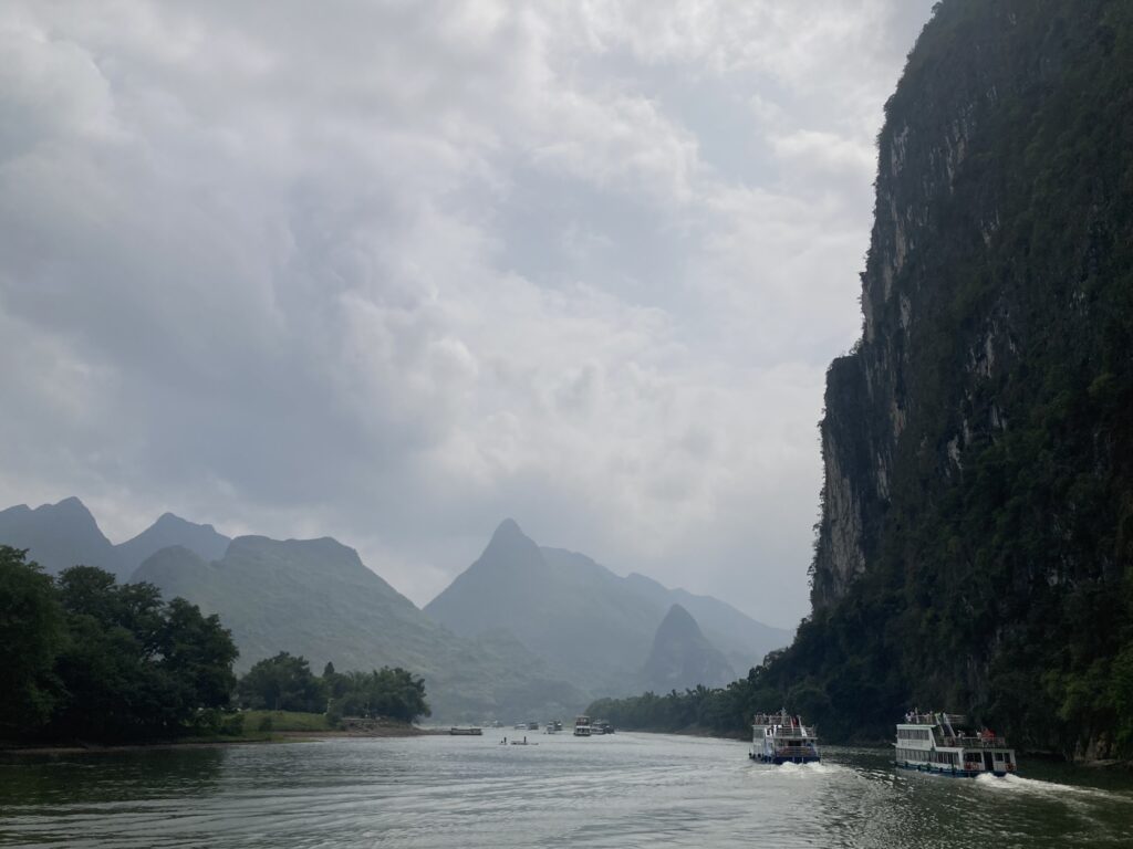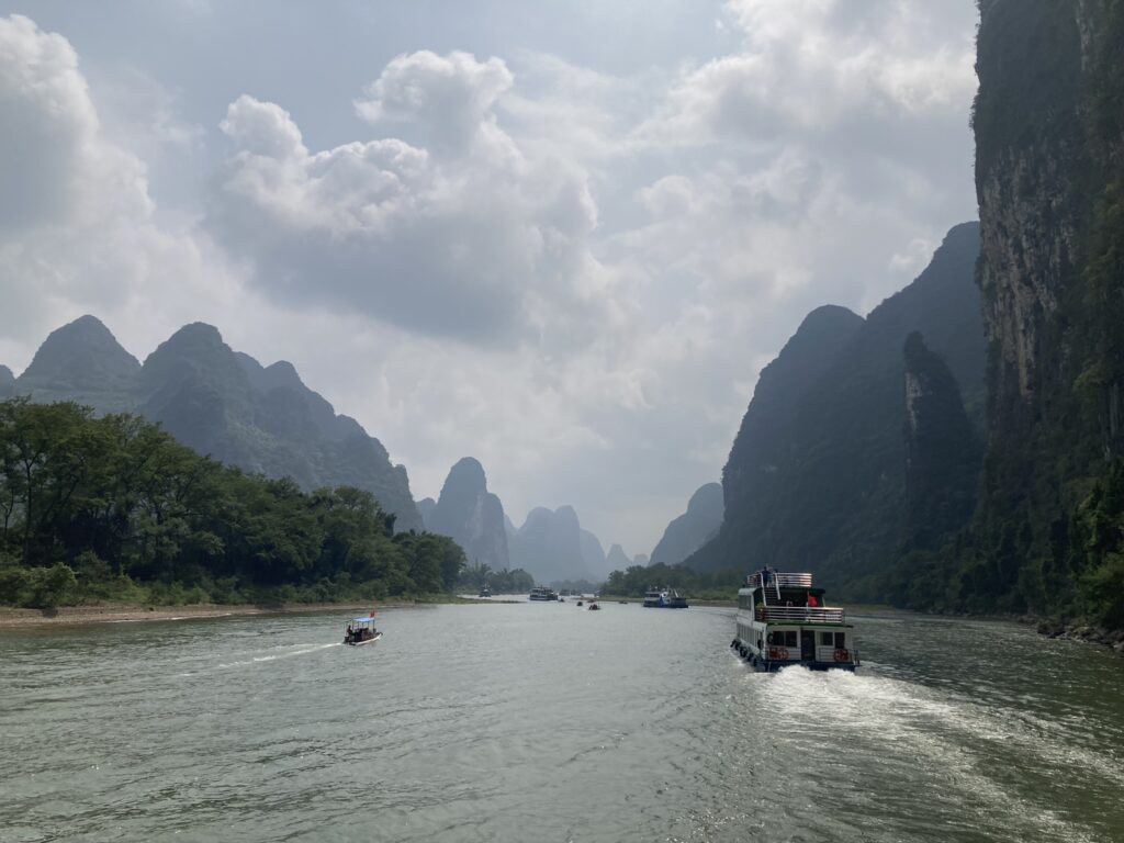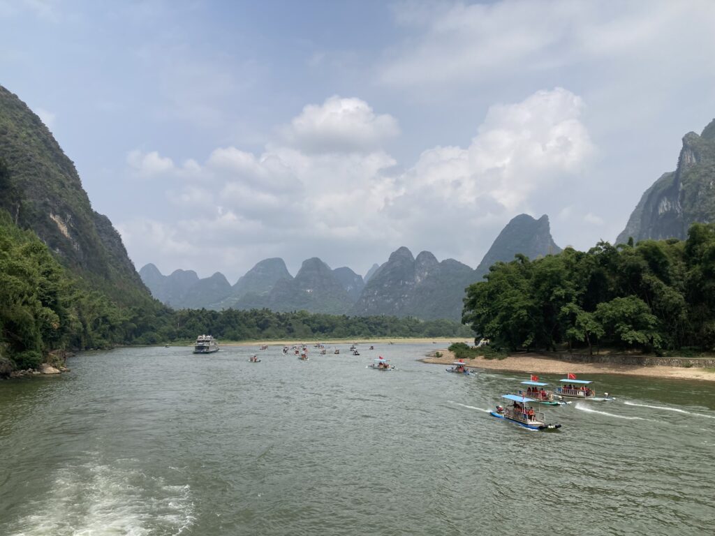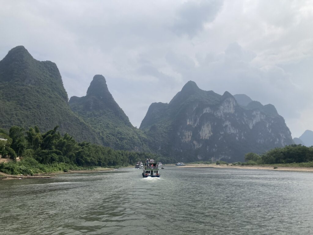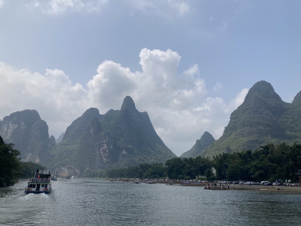 漓江(りこう)という川をゆっくり船でクルーズすると、丸い山があちらこちらでそそり立っていて、この地方特有の地形がみられます。