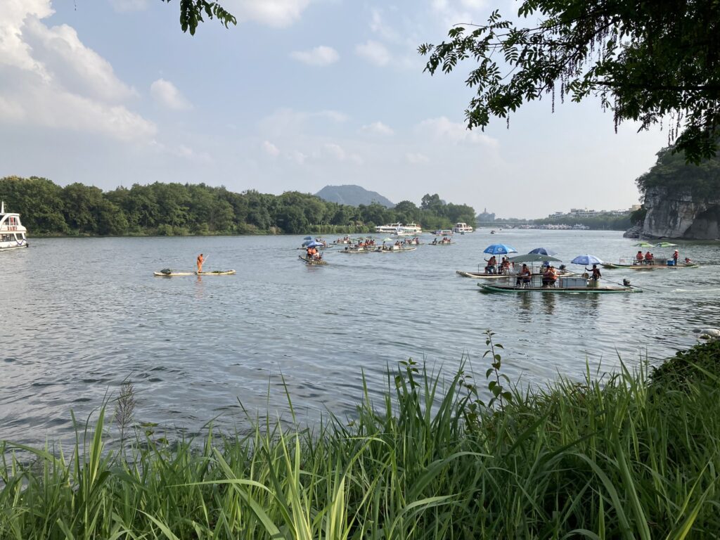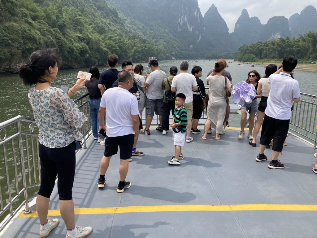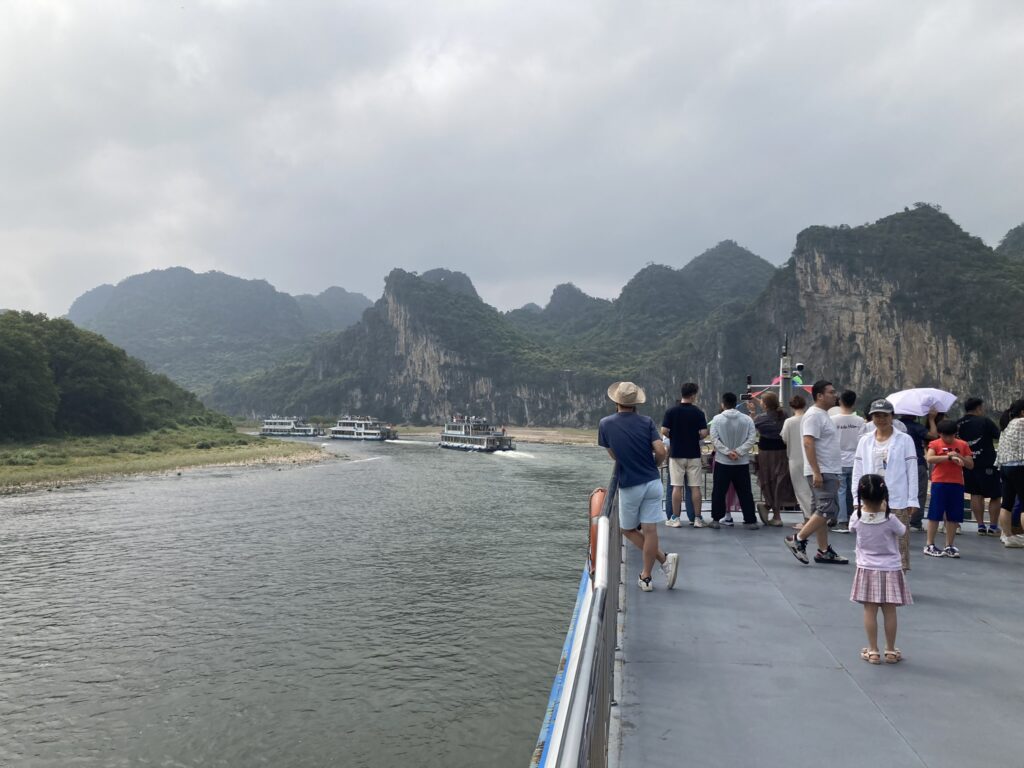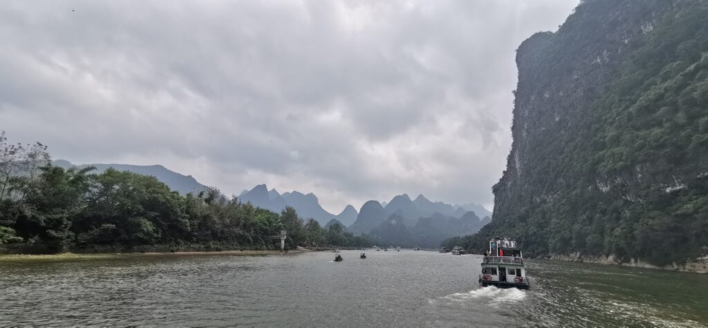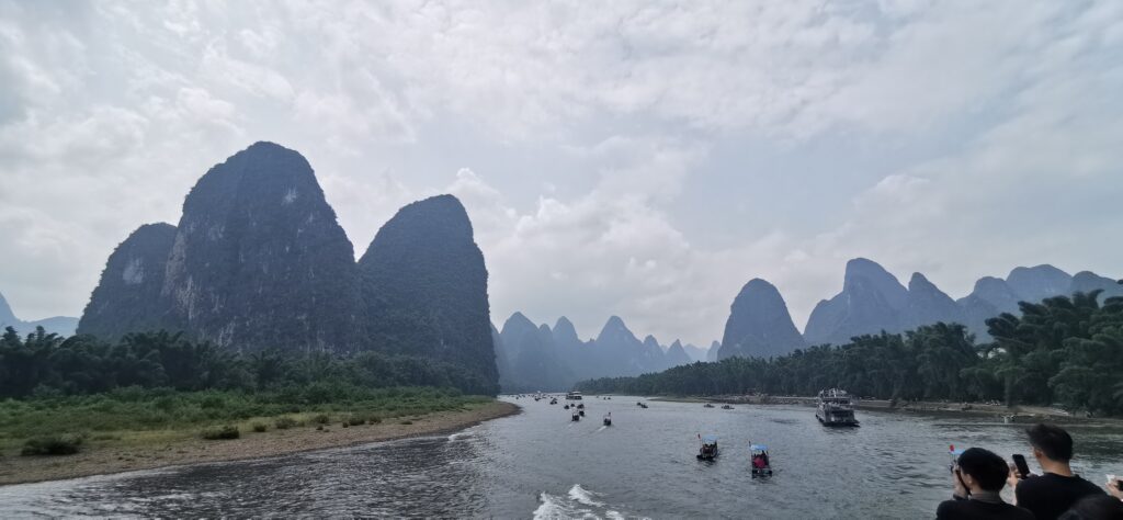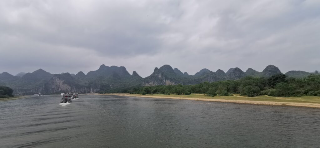 漓江(りこう)という川をゆっくり船でクルーズすると、丸い山があちらこちらでそそり立っていて、この地方特有の地形がみられます。