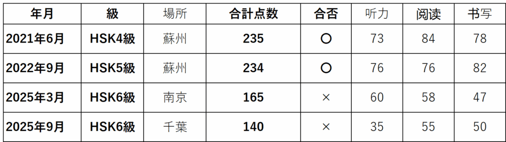 私のHSKの受験履歴を下記に示します。ちょっとお恥ずかしい内容です。