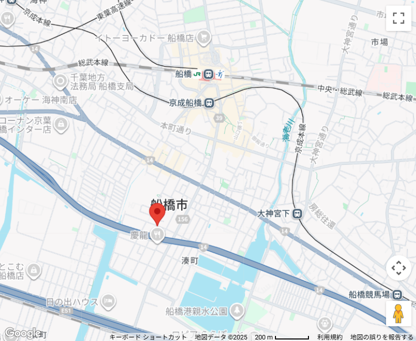 船橋駅を南に向かって15分くらい歩いて、大通りから少し細い路地に入った所にあります。