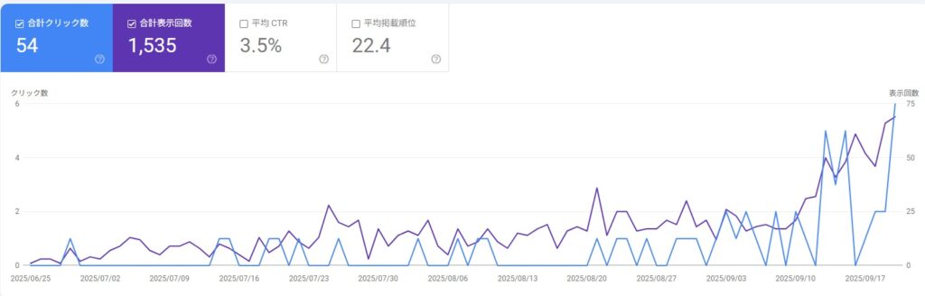 しかし、今、改めて「検索パフォーマンス」のページを見ると、何となく今月になってからクリック数が増えている様な気がします