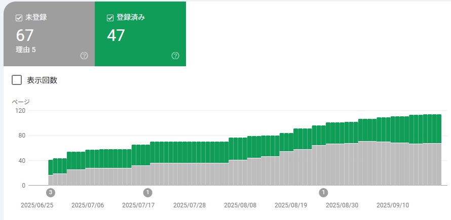 2カ月目くらいまで、上記のインデックスの登録数の「未登録」がなんでこんなに多いのか?全然分からなくて、Chat-GTPなどを使って原因を調べてみました。