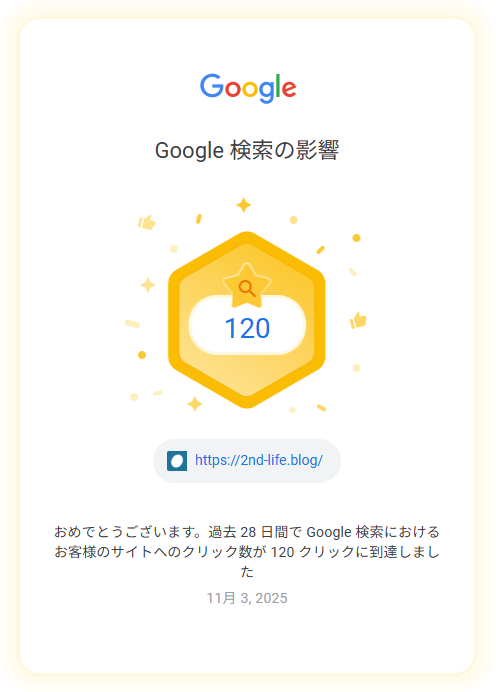 Google Search Consoleからもクリック数の連絡がありますが、一カ月前は28日間のクリック数が90でした。