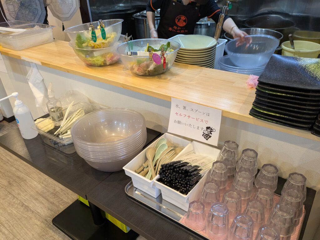 トングとボウル。水用のコップと箸、レンゲもここから取ります