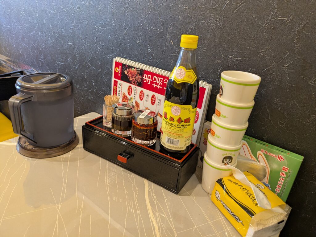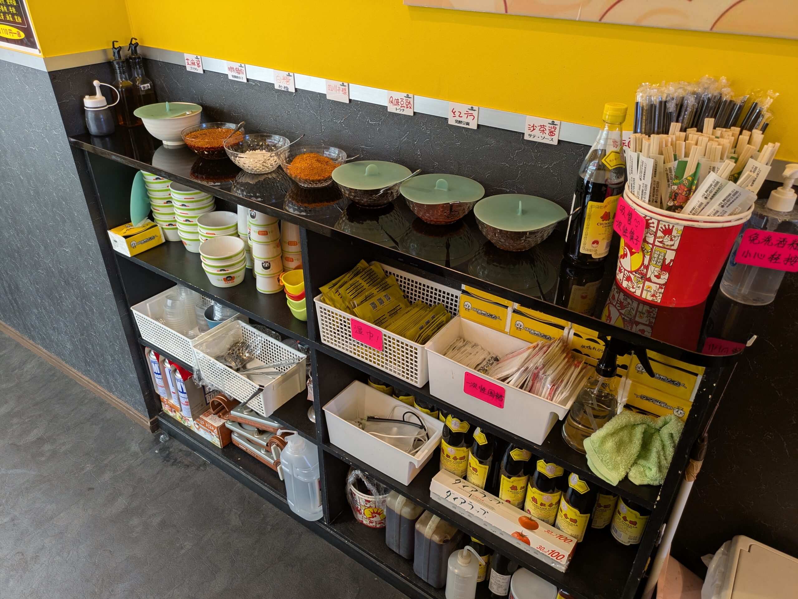 棚の反対側には薬味とかエプロンとかおいてある棚がありますので、味の調整が必要な方は出来上がった後、ここで調整しましょう。